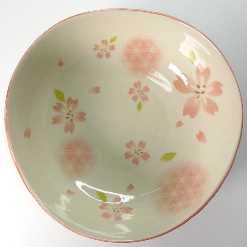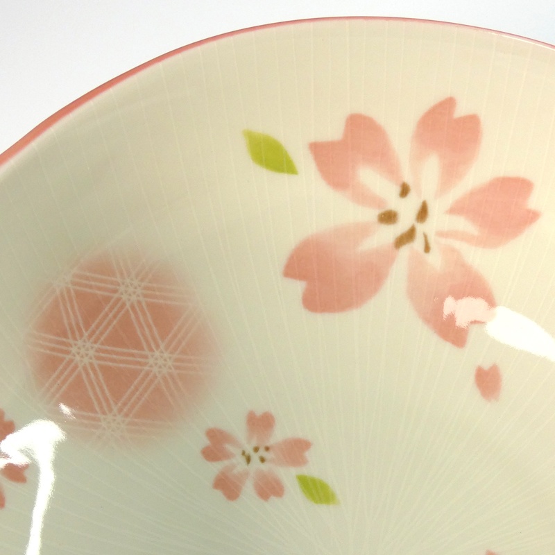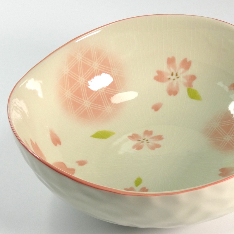 The pretty design in pastel pink and green features cherry blossoms, floating petals and subtle geometric lines. The edge of the bowl is finished with a gentle line in soft pink.